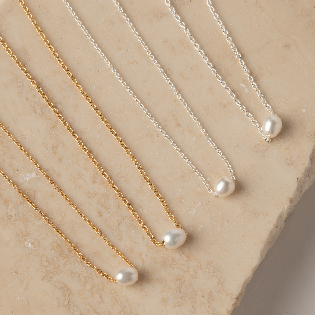 Choose from the single or double pearl sleepers, and a fine or medium weight 45cm pearl necklace.