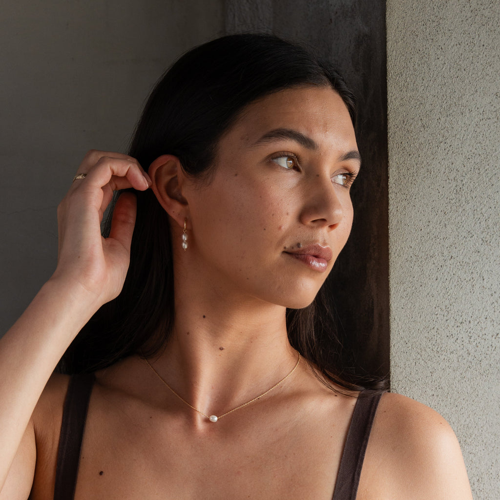 Including the Pearl Mini Huggies and Pearl Necklace.
