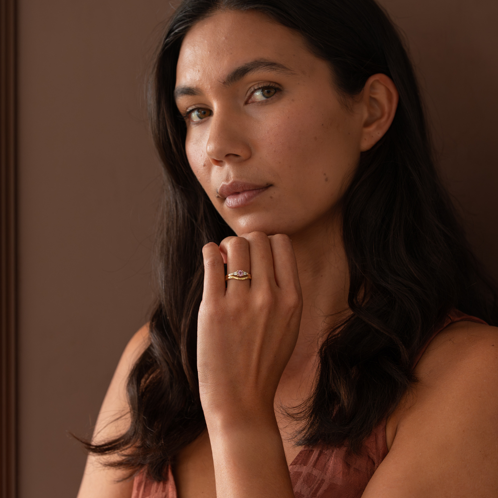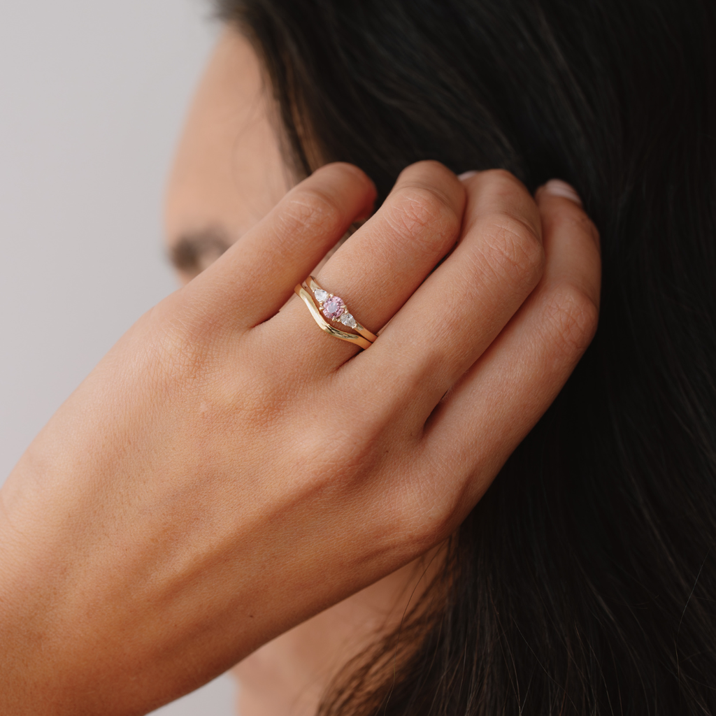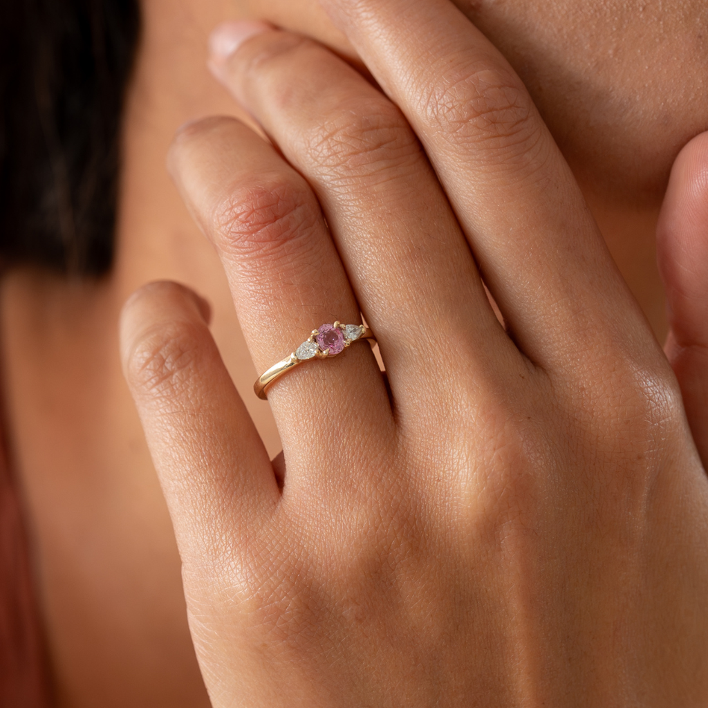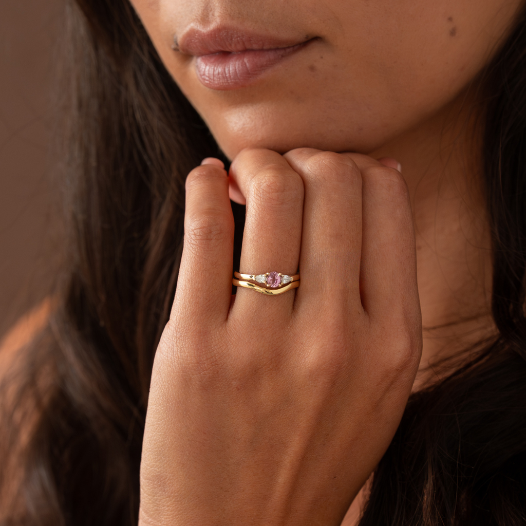 The Dahlia Collection celebrates one of our favourite flowers. A unique sapphire plays the centrepiece - a nod to the endless varieties of dahlia - and the pear shaped diamonds take the form of petals. Elegant, timeless, whimsical.