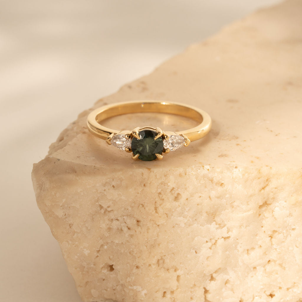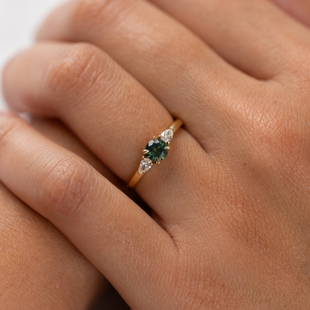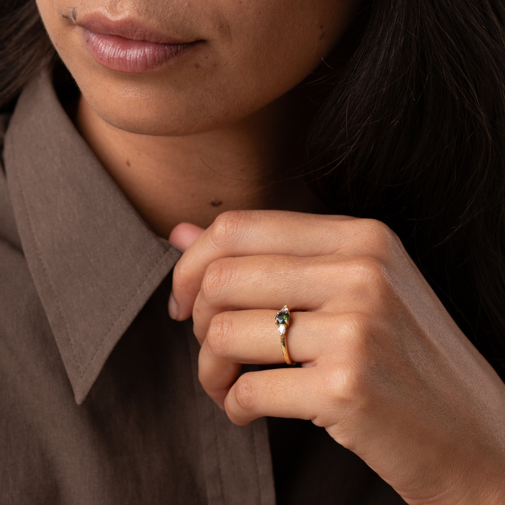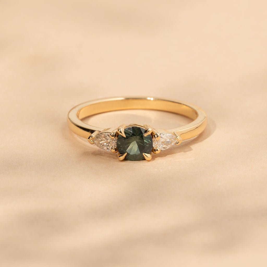 The Dahlia Collection celebrates one of our favourite flowers. A unique sapphire plays the centrepiece - a nod to the endless varieties of dahlia - and the pear shaped diamonds take the form of petals. Elegant, timeless, whimsical.