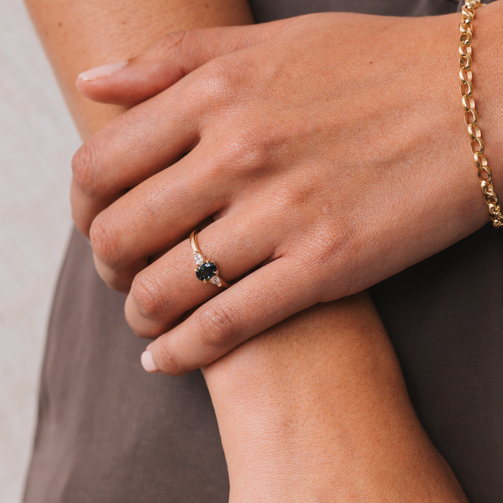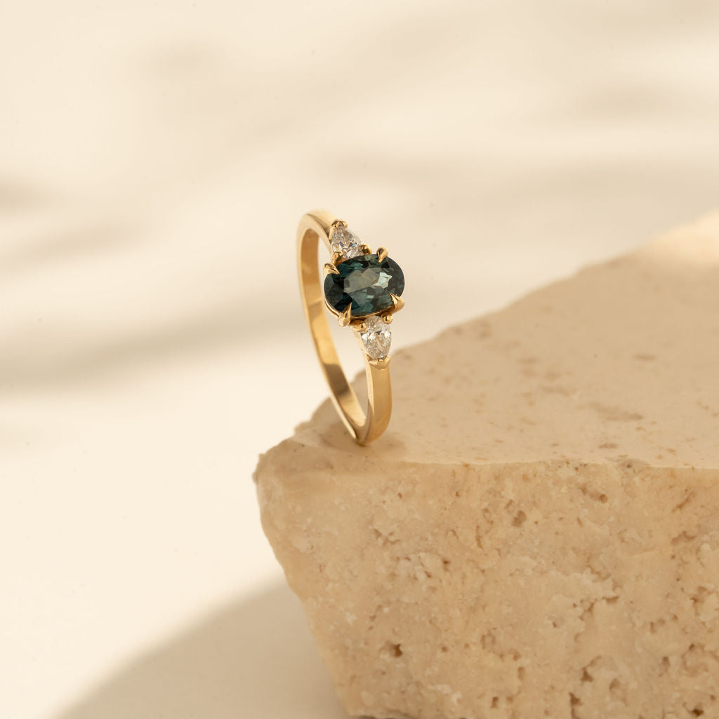 The Dahlia Collection celebrates one of our favourite flowers. A unique sapphire plays the centrepiece - a nod to the endless varieties of dahlia - and the pear shaped diamonds take the form of petals. Elegant, timeless, whimsical.